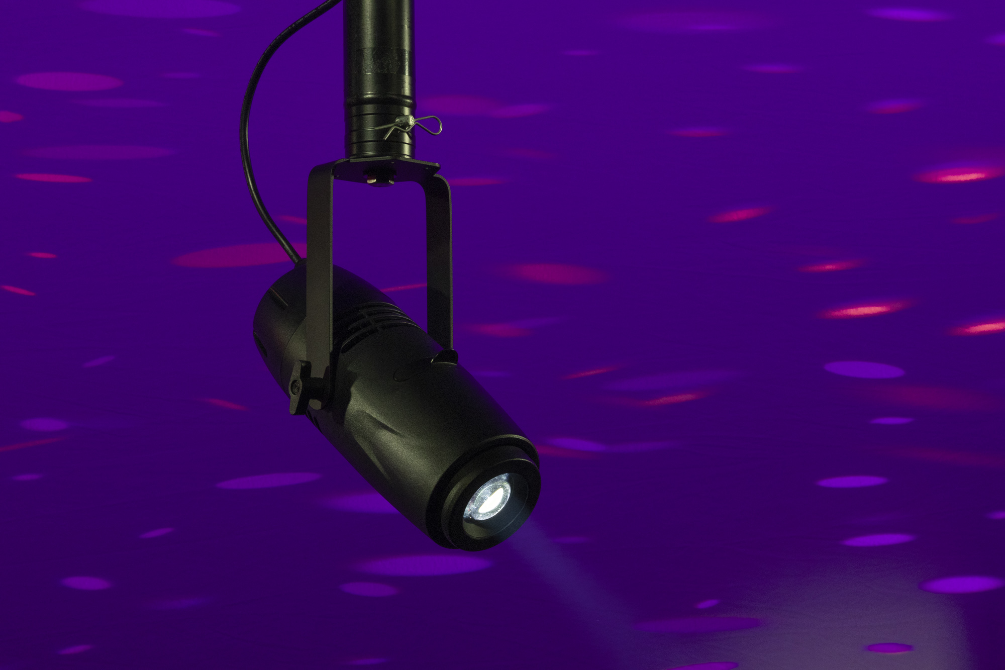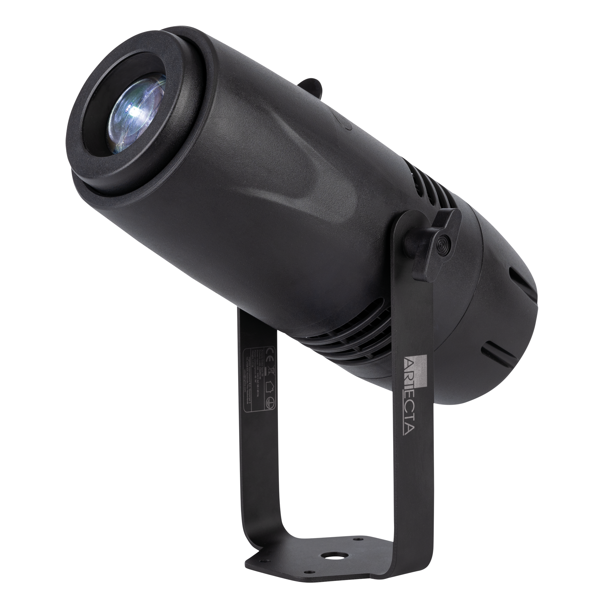 De Artecta Gobo Spot 50 is een compacte 50-watt gobo projector ontworpen voor het projecteren van heldere, opvallende logo’s en patronen. Met een vaste stralingshoek van 20° en een vervangbare, roterende glazen gobo (Ø 26,4 mm) is hij ideaal voor winkels, horeca, tentoonstellingen en thema-omgevingen. De rotatiesnelheid en -richting van de gobo kunnen eenvoudig worden aangepast via een regelknop achterop, zodat je dynamische visuele effecten kunt creëren zonder DMX nodig te hebben. Voor extra flexibiliteit is er een optionele lens van 30° verkrijgbaar, waardoor een bredere dekking mogelijk is wanneer dat nodig is.
