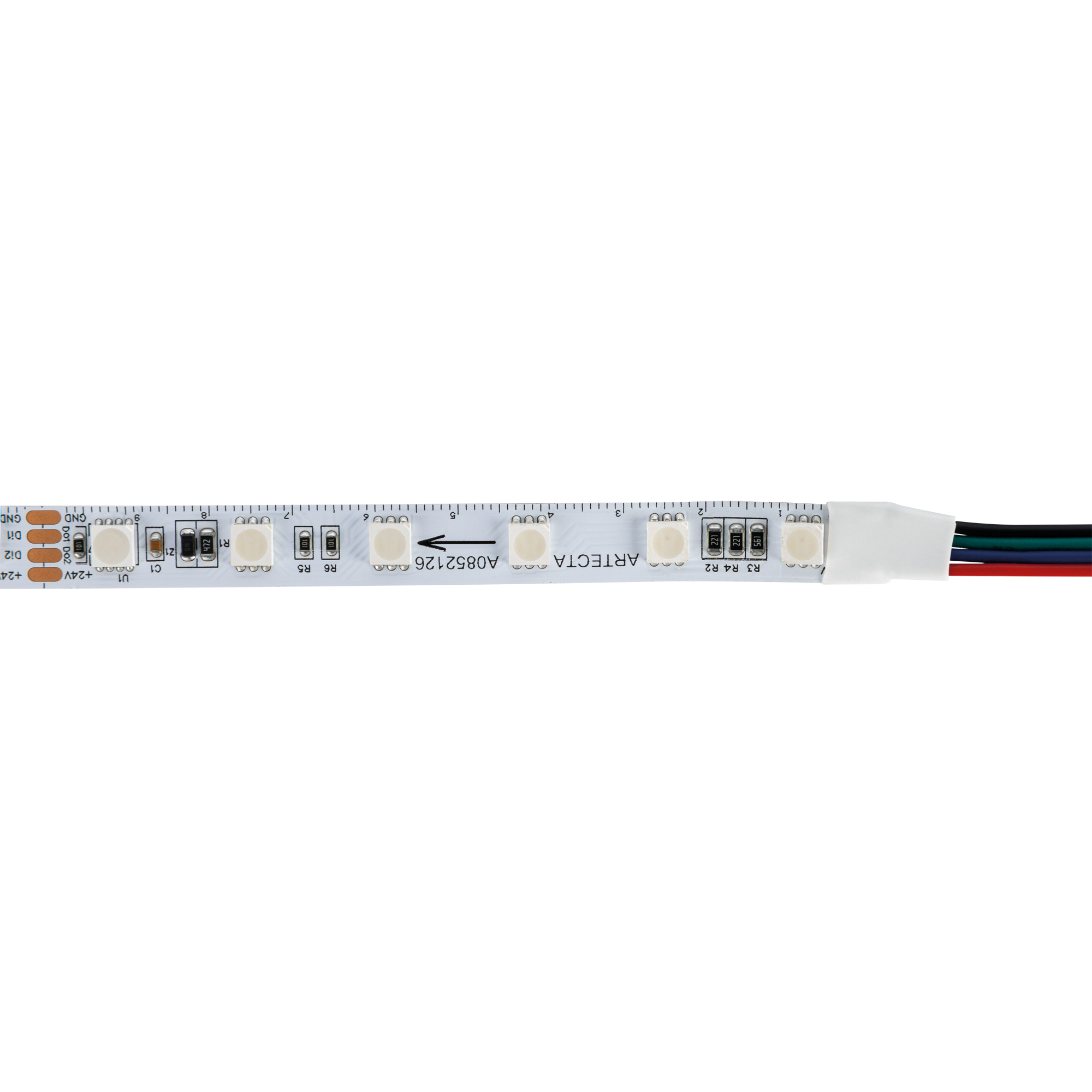 De Artecta Havana Pixel Strip is een 72 watt RGB LED-strip met Individual Pixel Control, geschikt voor indoor toepassingen. De 300 LED’s (60 / m) zijn aanstuurbaar per set van 6 LED’s, waardoor u 50 individueel aanstuurbare pixels kunt creëren die kunnen worden aangestuurd in combinatie met een geschikte pixel controller. Tot drie Havana Pixel Strips zijn in serie schakelbaar en kunnen werken op één enkele 24 V voedingsadapter. Dankzij de zelfklevende 3M-laag kan de strip op vrijwel elk glad, ontvet oppervlak worden bevestigd. Ook kan de strip perfect worden gebruikt in een aluminium profiel met een afdekking voor bescherming tegen stof en vocht.