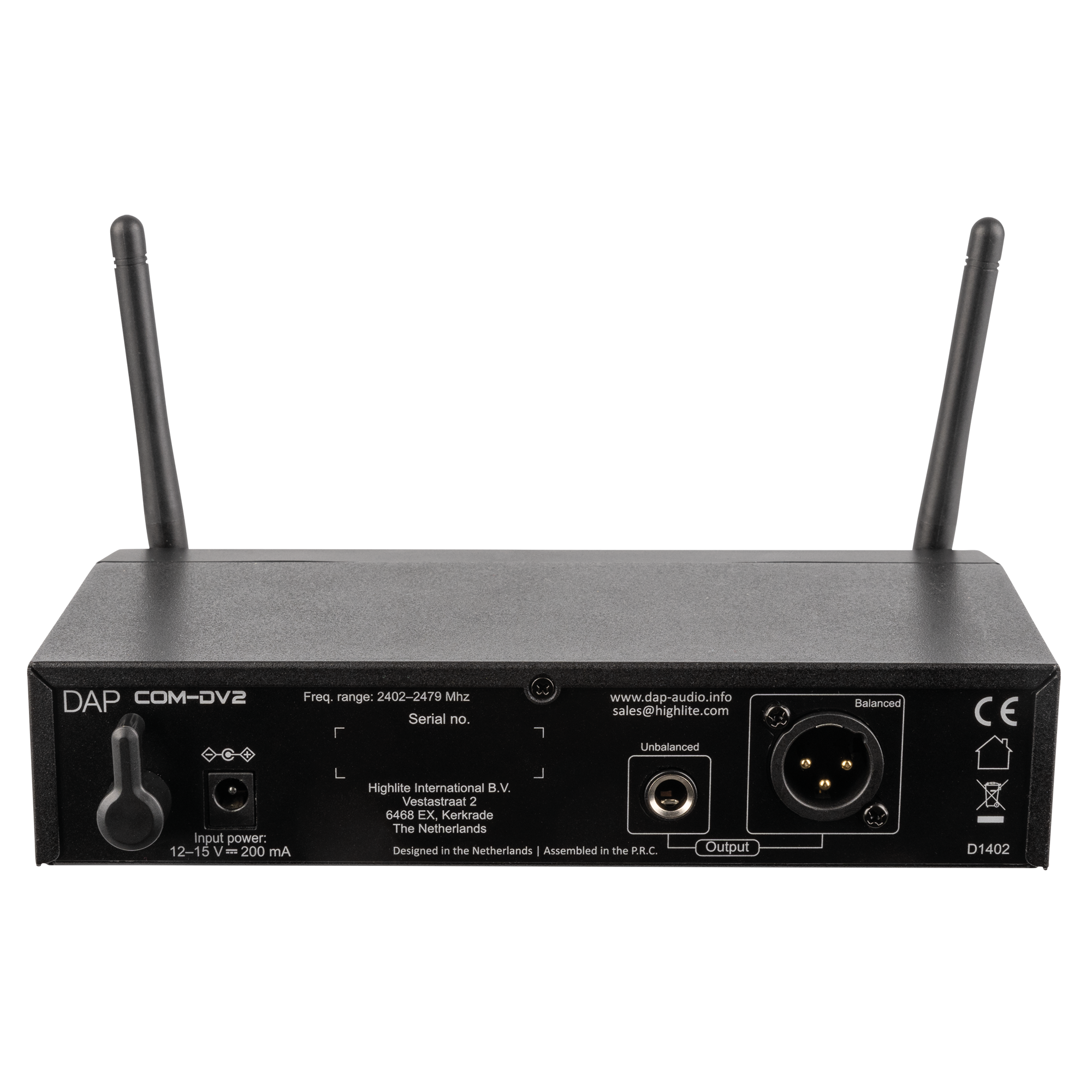 De DAP COM DV-2 is een draadloze handmicrofoonset die werkt in de licentievrije 2,4 GHz-band. De microfoon heeft een dynamische kop met 8 gain-instellingen. Een interne 24-bit/48-kHz-converter prepareert het audiosignaal voor draadloze transmissie met lage latentie. De handmicrofoon heeft een LED-statusindicatiering die de huidige bedrijfsstatus weergeeft. Hij gaat tot 10 uur mee op een paar AA-batterijen.