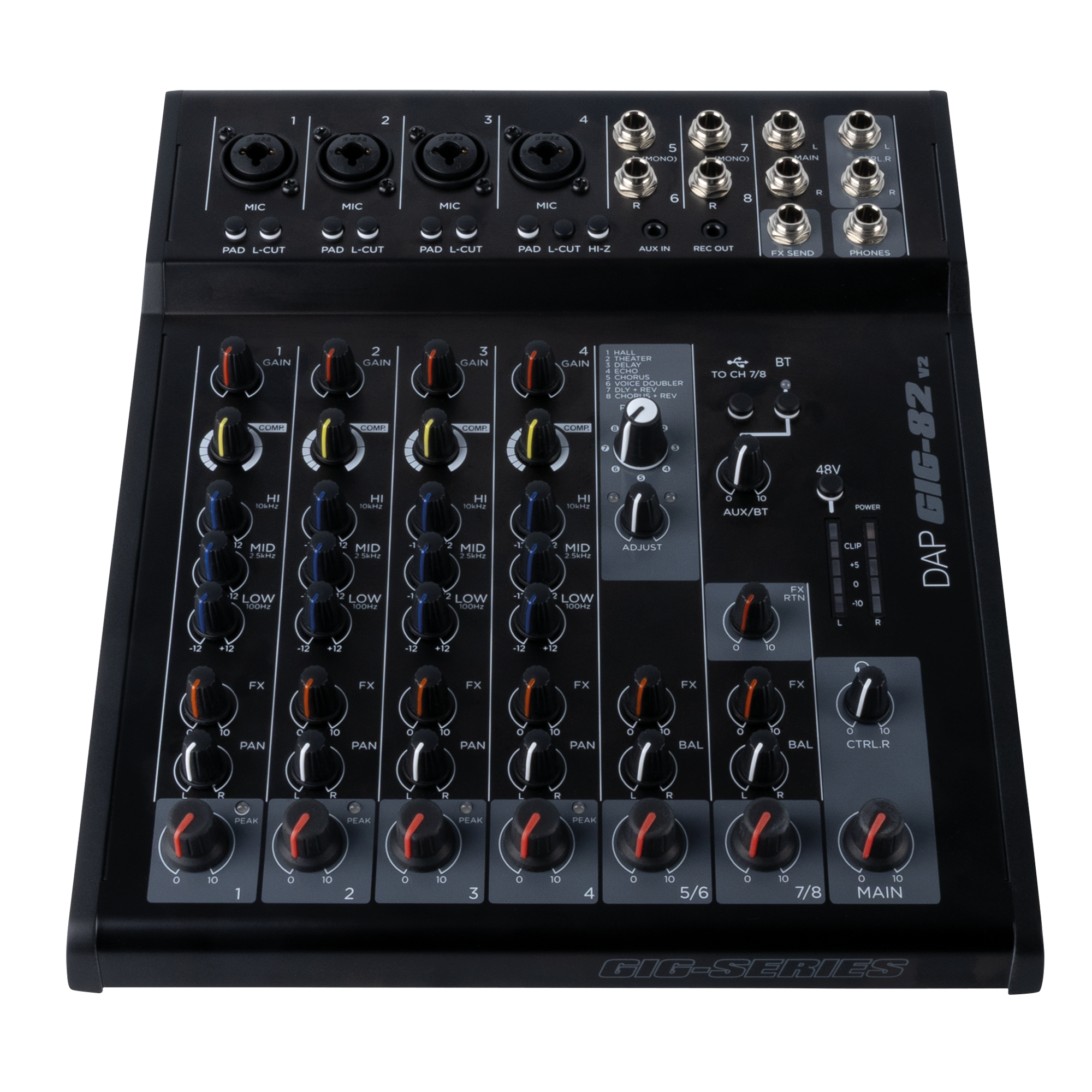 De GIG-82 V2 heeft acht interne digitale effecten die kunnen worden toegepast op alle kanalen behalve Aux en BT. Een FX-send-uitgang maakt signaalroutering naar externe effectprocessors mogelijk of hij kan worden gebruikt als monitor-send-bus. Een duidelijke LED-VU-meter geeft visuele feedback over de uitgangsniveaus en de mixer wordt gevoed door een eigen ±15V DC externe voeding voor een stabiele werking.