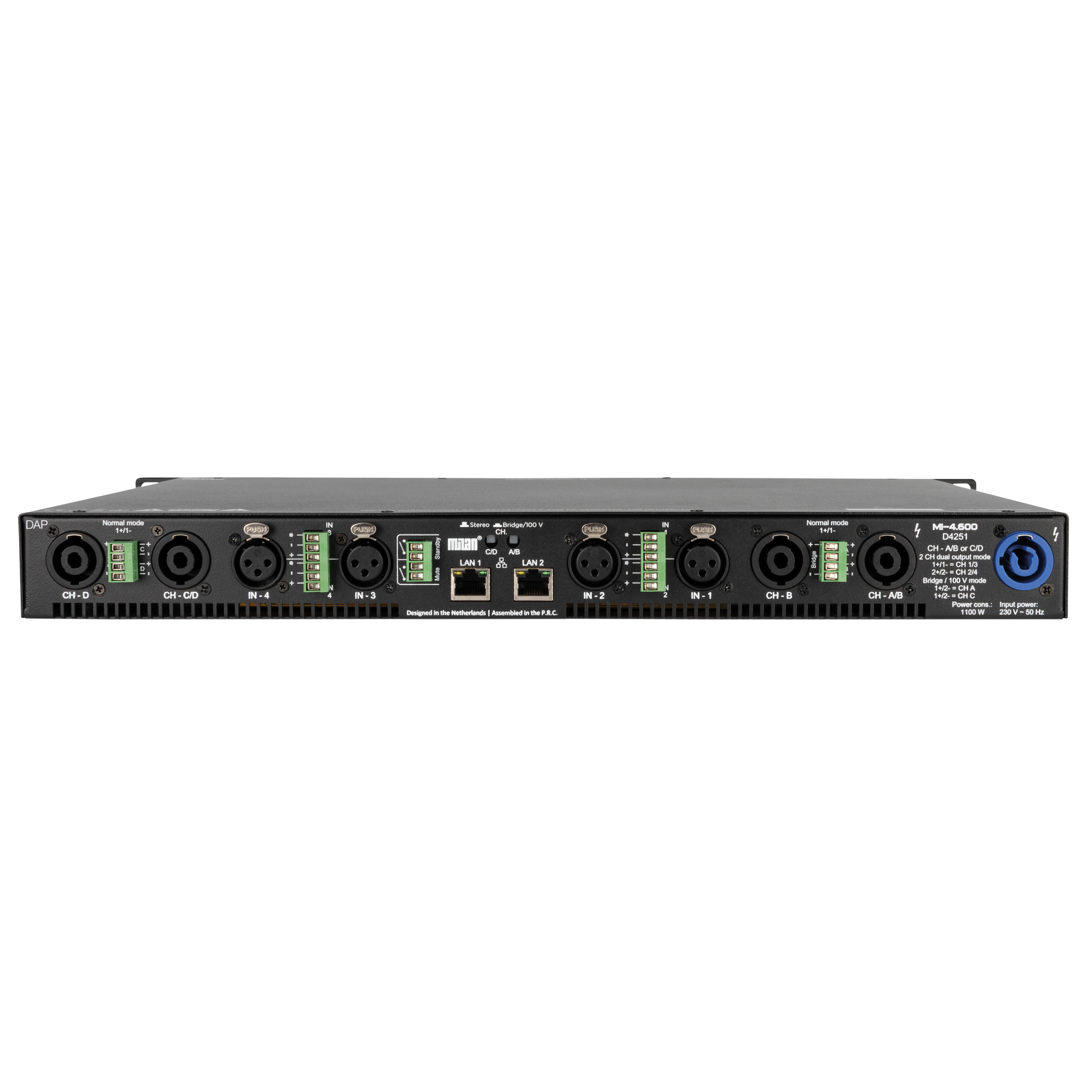 De DAP MI 4.600 is een compacte 1U Klasse D-installatieversterker die een hoog vermogen combineert met geavanceerde audionetwerkfuncties en krachtige DSP. Met een vermogen van 4 x 600 W bij 4 O is hij geschikt voor diverse toepassingen, zoals commerciële locaties met meerdere zones, theaters, conferentiecentra en meer. Dankzij een via IP aangestuurde DSP en een Milan AVB-gecertificeerde digitale ingang kan de MI 4.600 perfect worden geïntegreerd in moderne netwerkaudiosystemen. Voor systeemontwerpers die werken met infrastructuren met gemengde impedanties heeft de MI 4.600 ook een bridge-modus met 100 V-ondersteuning. Dankzij de terminals en 2-polige luidsprekeruitgangen is aansluiten in zowel vaste installaties als rackopstellingen heel makkelijk.