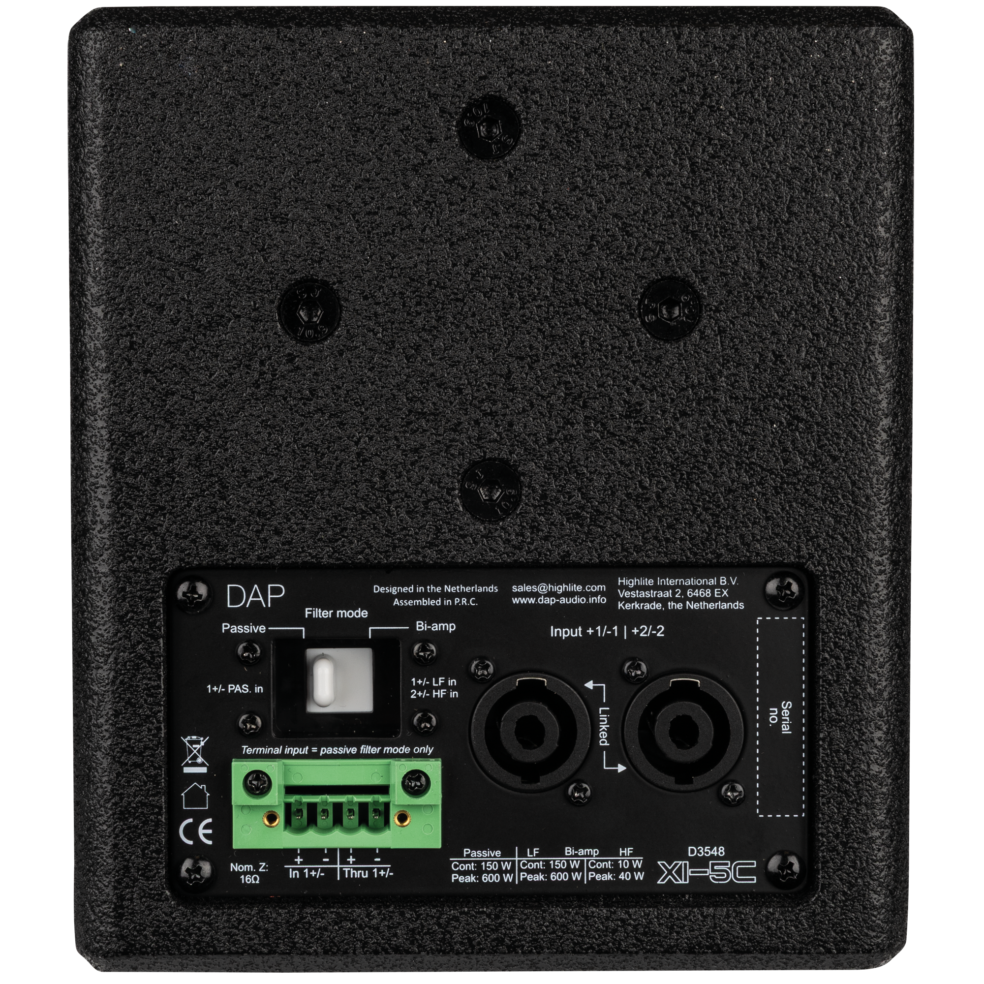 De installatie is snel en betrouwbaar dankzij twee gelinkte 4-polige luidsprekeraansluitingen (die passieve en bi-amp-modi ondersteunen) voor eenvoudige doorlusverbindingen en een 4-polige terminalconnector (alleen passieve modus) met doorlusverbinding voor vaste bedrading. Een M6-bevestigingspunt met schroefdraad aan de bovenkant biedt eenvoudige bevestigingsmogelijkheden, de achterkant is voorzien van gaten voor de DAP Universele Luidsprekerbeugel en de zijkanten hebben gaten voor de speciale Ophangbeugel voor Xi-5C. Aan de onderkant maakt een geïntegreerde 3/8″-schroefdraad bevestiging op een (microfoon)statief mogelijk. De robuuste zwarte coating en het stalen rooster zorgen voor duurzaamheid en een discrete uitstraling die in elk interieur past.