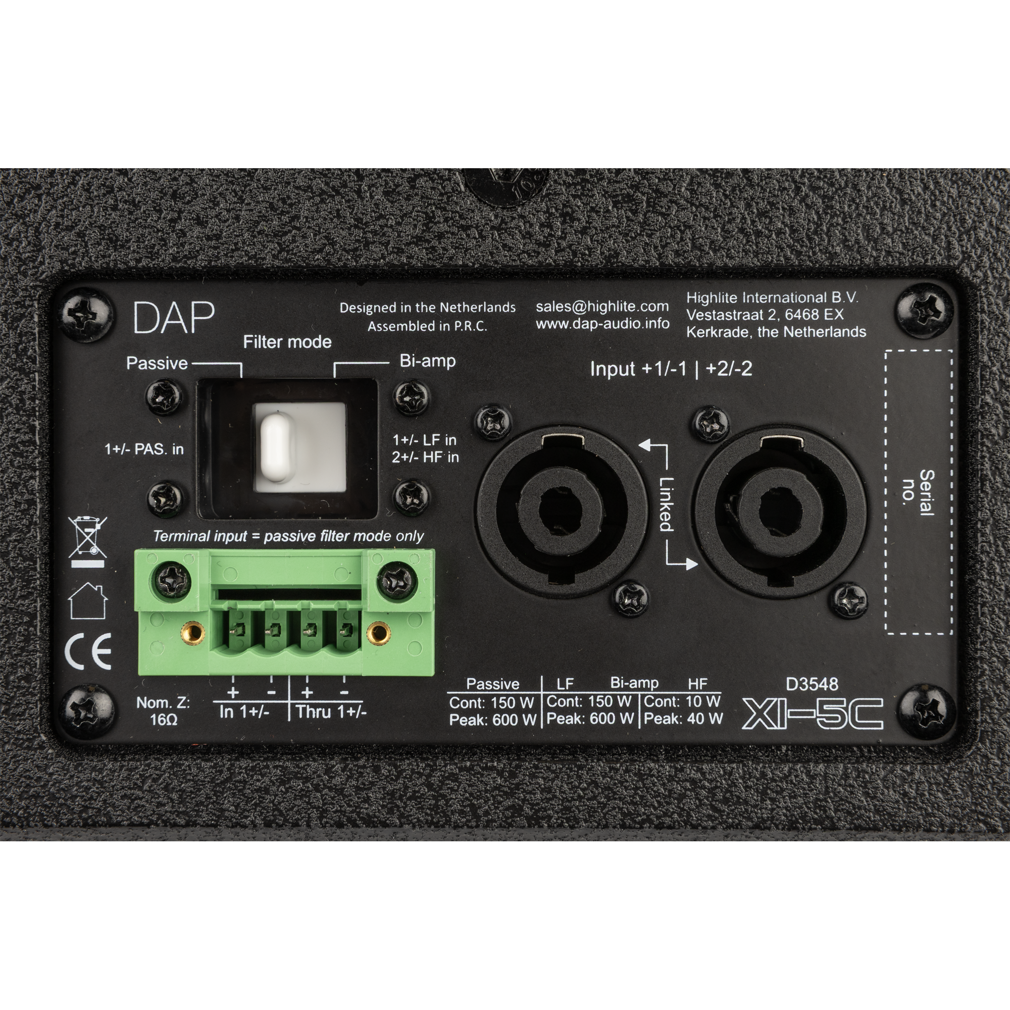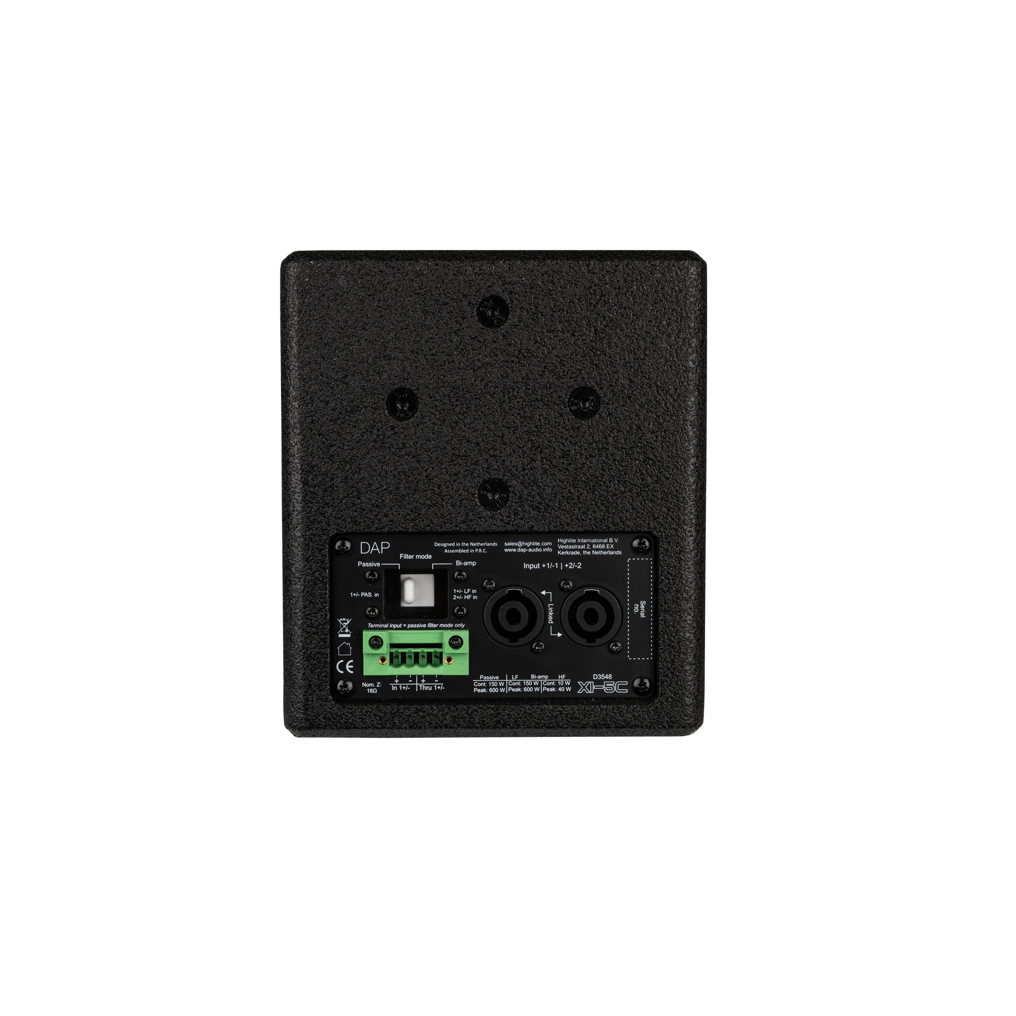 De installatie is snel en betrouwbaar dankzij twee gelinkte 4-polige luidsprekeraansluitingen (die passieve en bi-amp-modi ondersteunen) voor eenvoudige doorlusverbindingen en een 4-polige terminalconnector (alleen passieve modus) met doorlusverbinding voor vaste bedrading. Een M6-bevestigingspunt met schroefdraad aan de bovenkant biedt eenvoudige bevestigingsmogelijkheden, de achterkant is voorzien van gaten voor de DAP Universele Luidsprekerbeugel en de zijkanten hebben gaten voor de speciale Ophangbeugel voor Xi-5C. Aan de onderkant maakt een geïntegreerde 3/8″-schroefdraad bevestiging op een (microfoon)statief mogelijk. De robuuste zwarte coating en het stalen rooster zorgen voor duurzaamheid en een discrete uitstraling die in elk interieur past.
