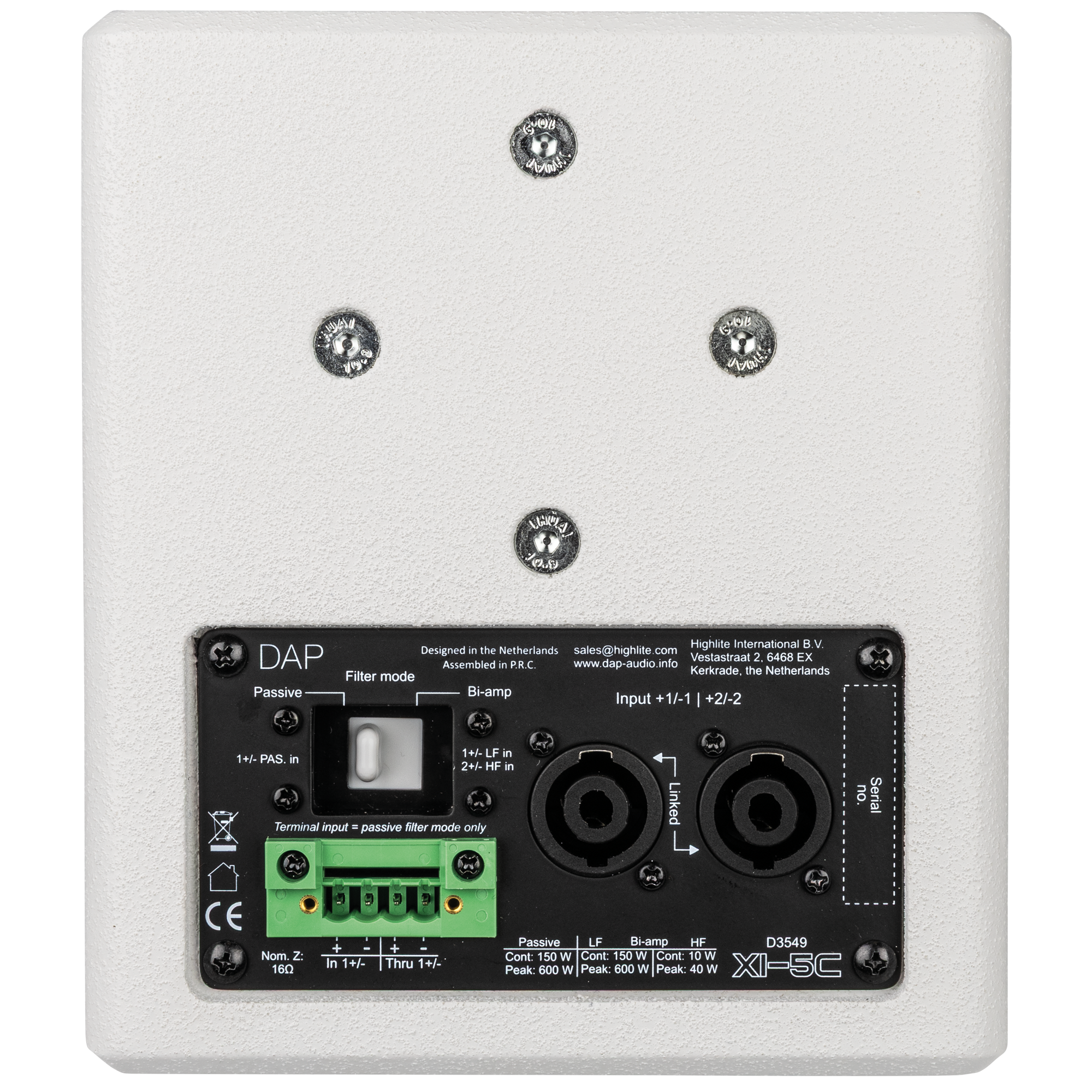 De installatie is snel en betrouwbaar dankzij twee gelinkte 4-polige luidsprekeraansluitingen (die passieve en bi-amp-modi ondersteunen) voor eenvoudige doorlusverbindingen en een 4-polige terminalconnector (alleen passieve modus) met doorlusverbinding voor vaste bedrading. Een M6-bevestigingspunt met schroefdraad aan de bovenkant biedt eenvoudige bevestigingsmogelijkheden, de achterkant is voorzien van gaten voor de DAP Universele Luidsprekerbeugel en de zijkanten hebben gaten voor de speciale Ophangbeugel voor Xi-5C. Aan de onderkant maakt een geïntegreerde 3/8″-schroefdraad bevestiging op een (microfoon)statief mogelijk. De robuuste zwarte coating en het stalen rooster zorgen voor duurzaamheid en een discrete uitstraling die in elk interieur past.