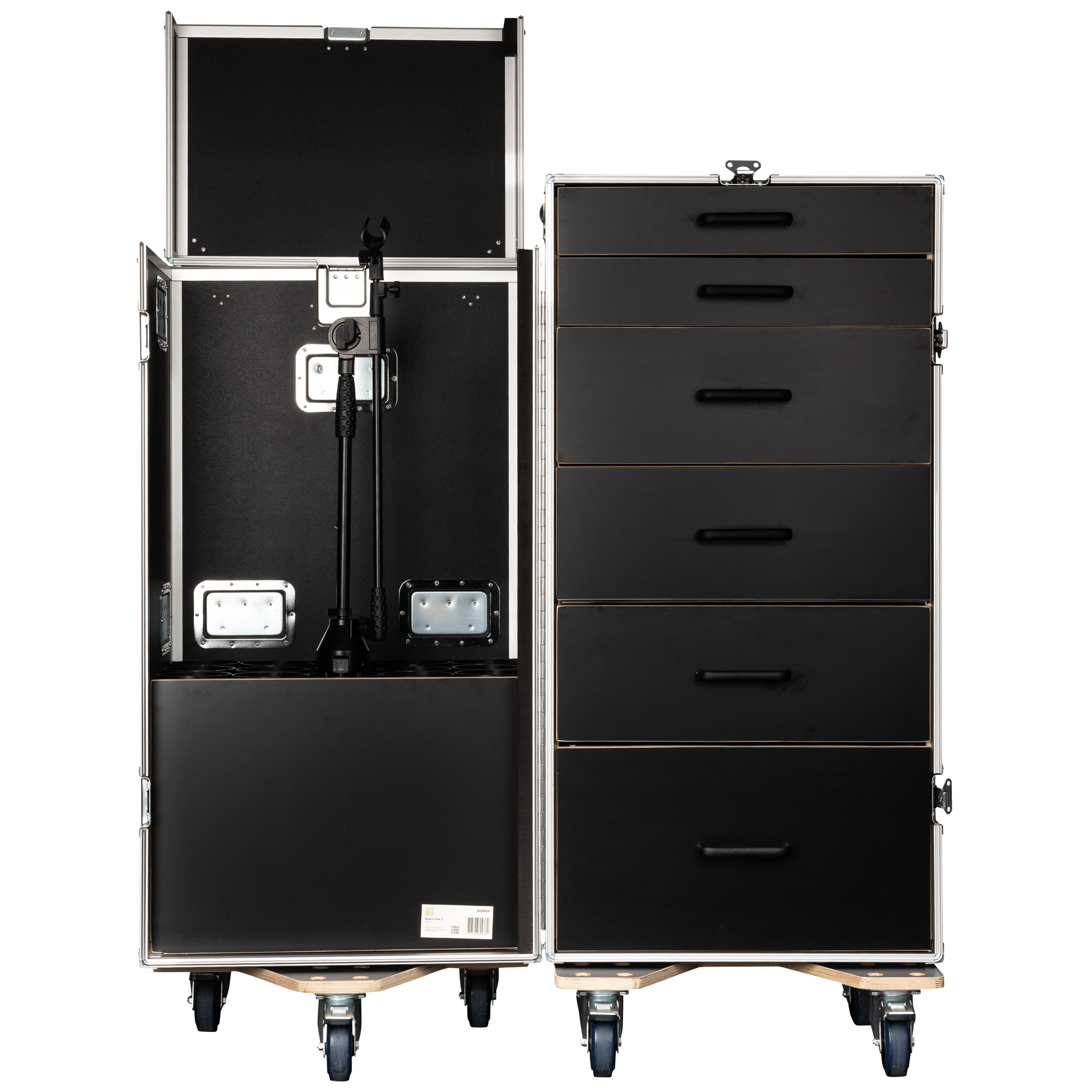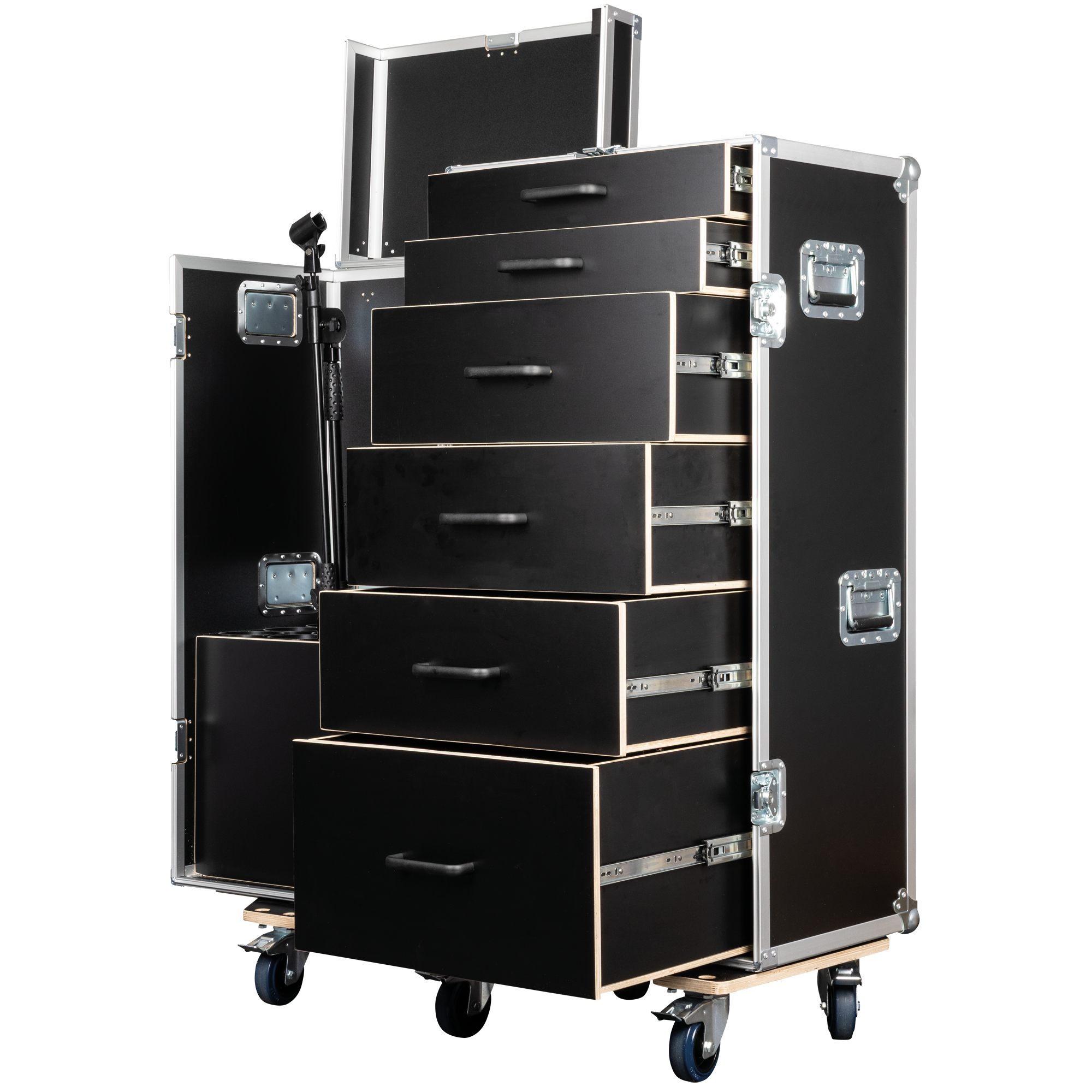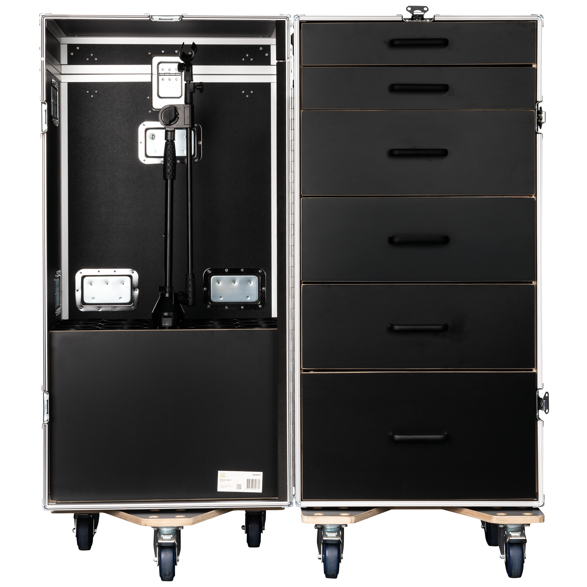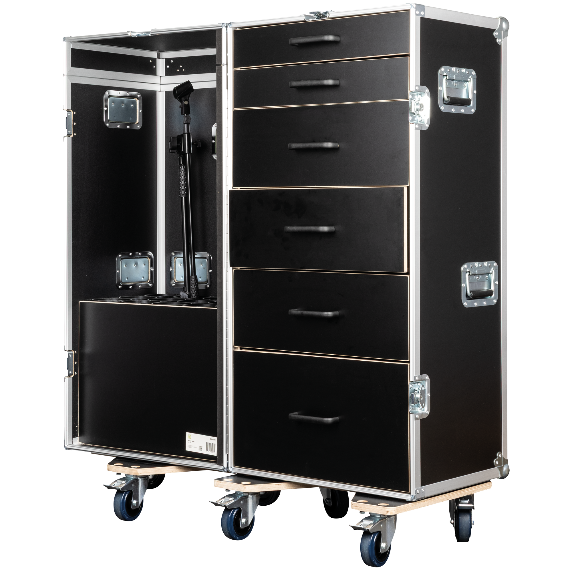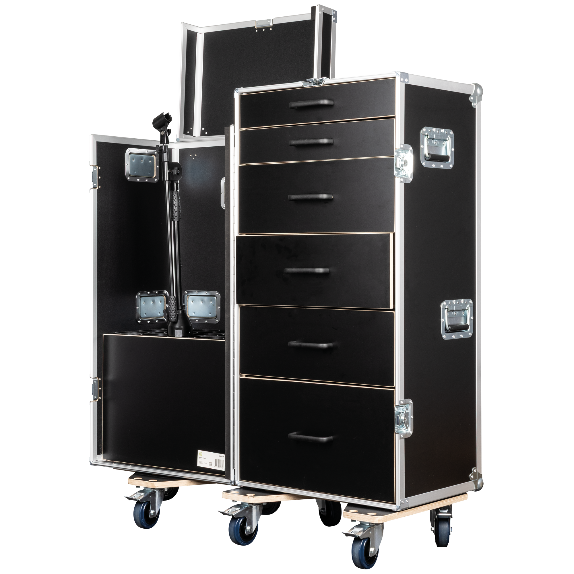 De Showgear Drawer Case 3 is een hoge, multifunctionele flightcase die is ontworpen voor professionals die behoefte hebben aan zowel gestructureerde opslag als veilig transport van microfoonstatieven. De koffer heeft zes lades in het achterste gedeelte, ideaal voor het ordenen van gereedschap, accessoires en kleine apparatuur, en in het voorste compartiment kunnen maximaal 15 microfoonstandaards rechtop worden opgeborgen.