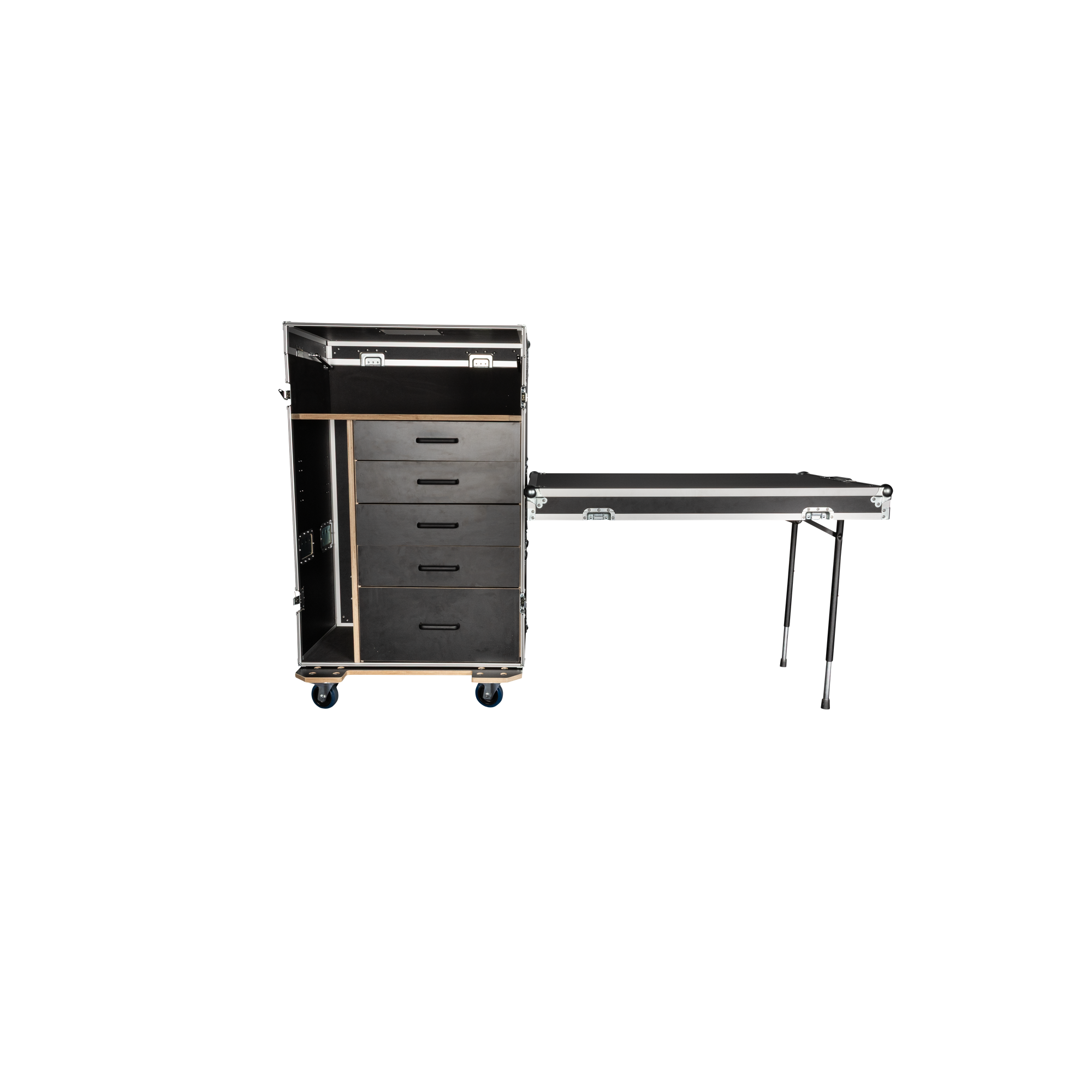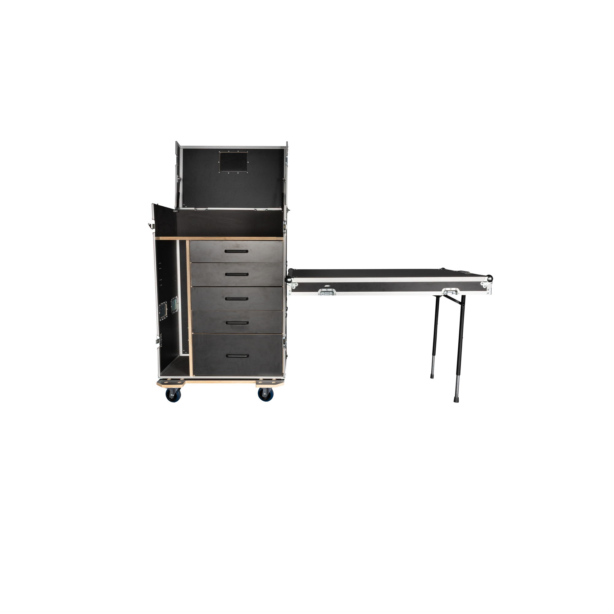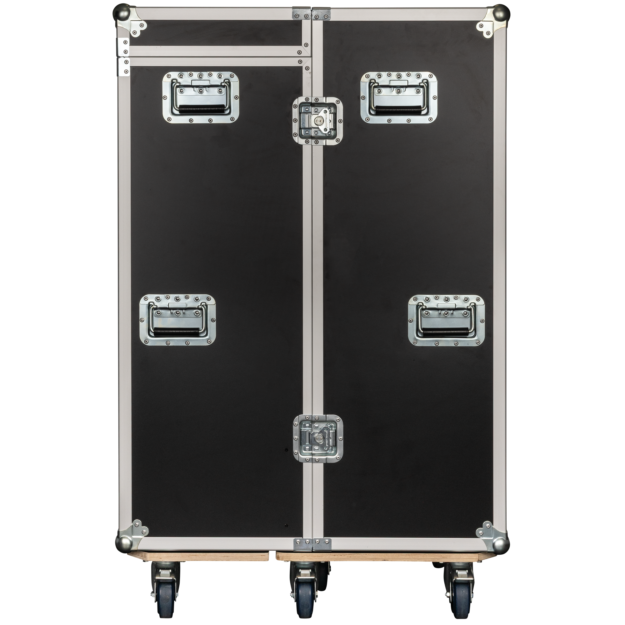De koffer is vervaardigd met hoogwaardige Penn Elcom-hardware en ontworpen voor degelijkheid en gebruiksgemak. Hij heeft ergonomische handgrepen aan alle kanten voor comfortabel gebruik, zeven zwenkwielen met remmen voor vlotte verplaatsing en veilige positionering, en een labelschotel voor snelle identificatie.