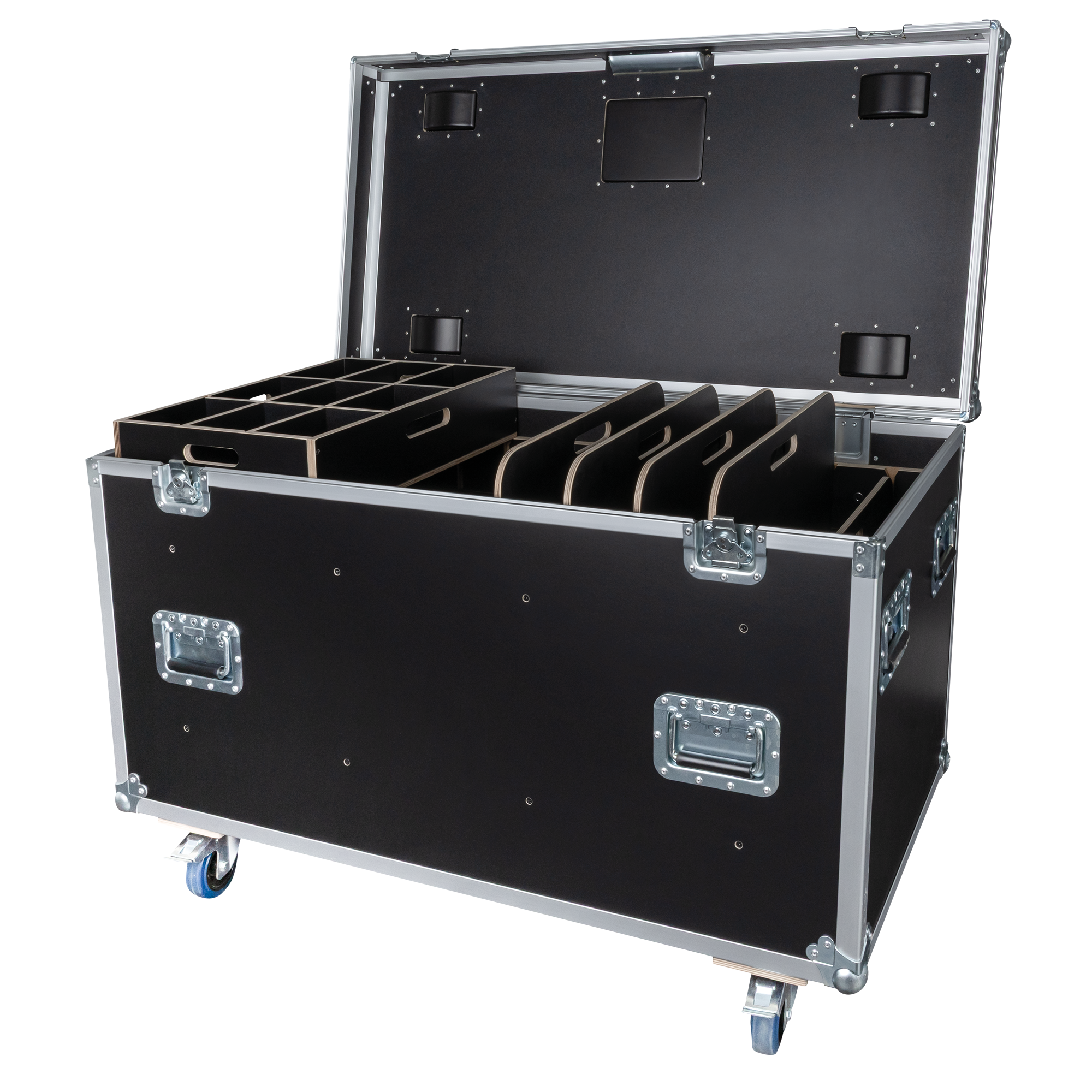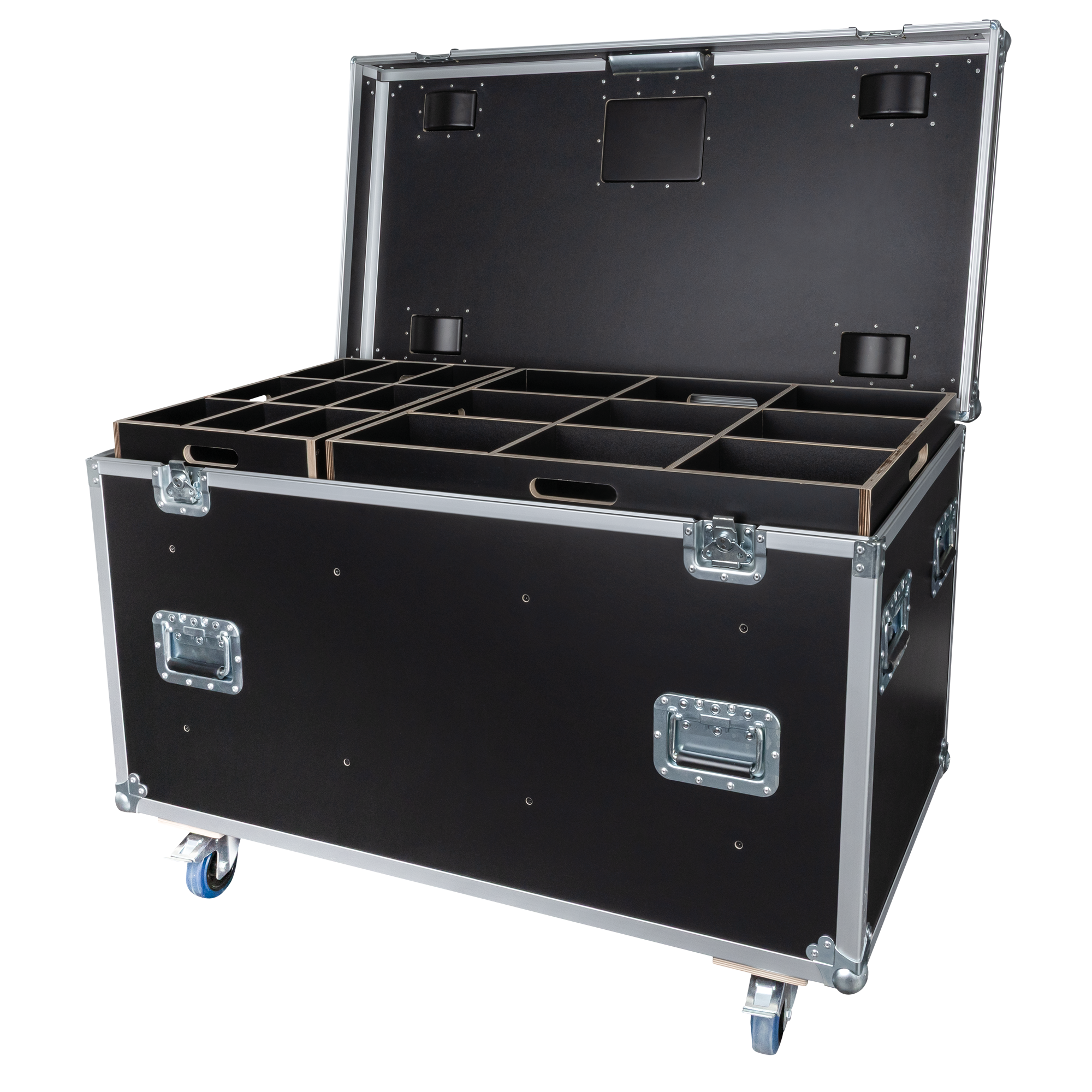 Deze flightcase is gemaakt van hoogwaardig 9 mm multiplex en voorzien van betrouwbare Penn Elcom-hardware, waardoor hij bestand is tegen de zware omstandigheden van tournees en veelvuldig gebruik. Vier 100 mm zwenkwielen met rem zorgen voor gemakkelijke verplaatsbaarheid en een veilige positionering, terwijl twee geveerde handgrepen aan elke kant een comfortabele grip bieden voor het tillen en hanteren. Dankzij vier wielschotels kunnen meerdere flightcases veilig worden gestapeld zonder het risico dat ze verschuiven of wegrollen.