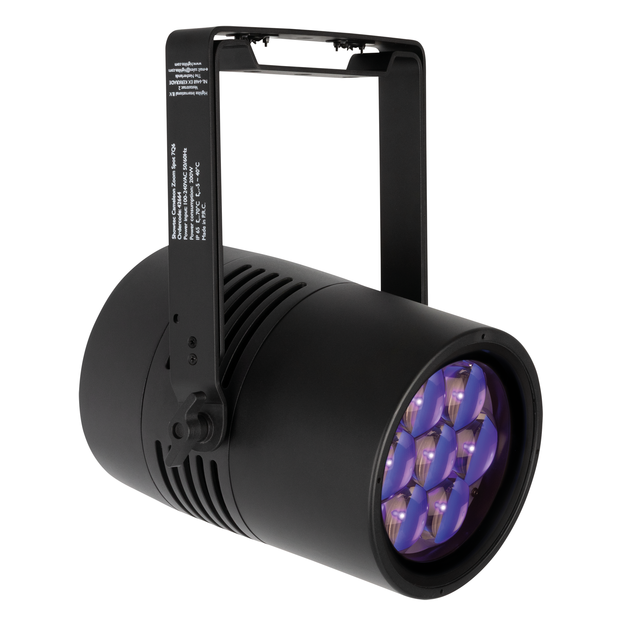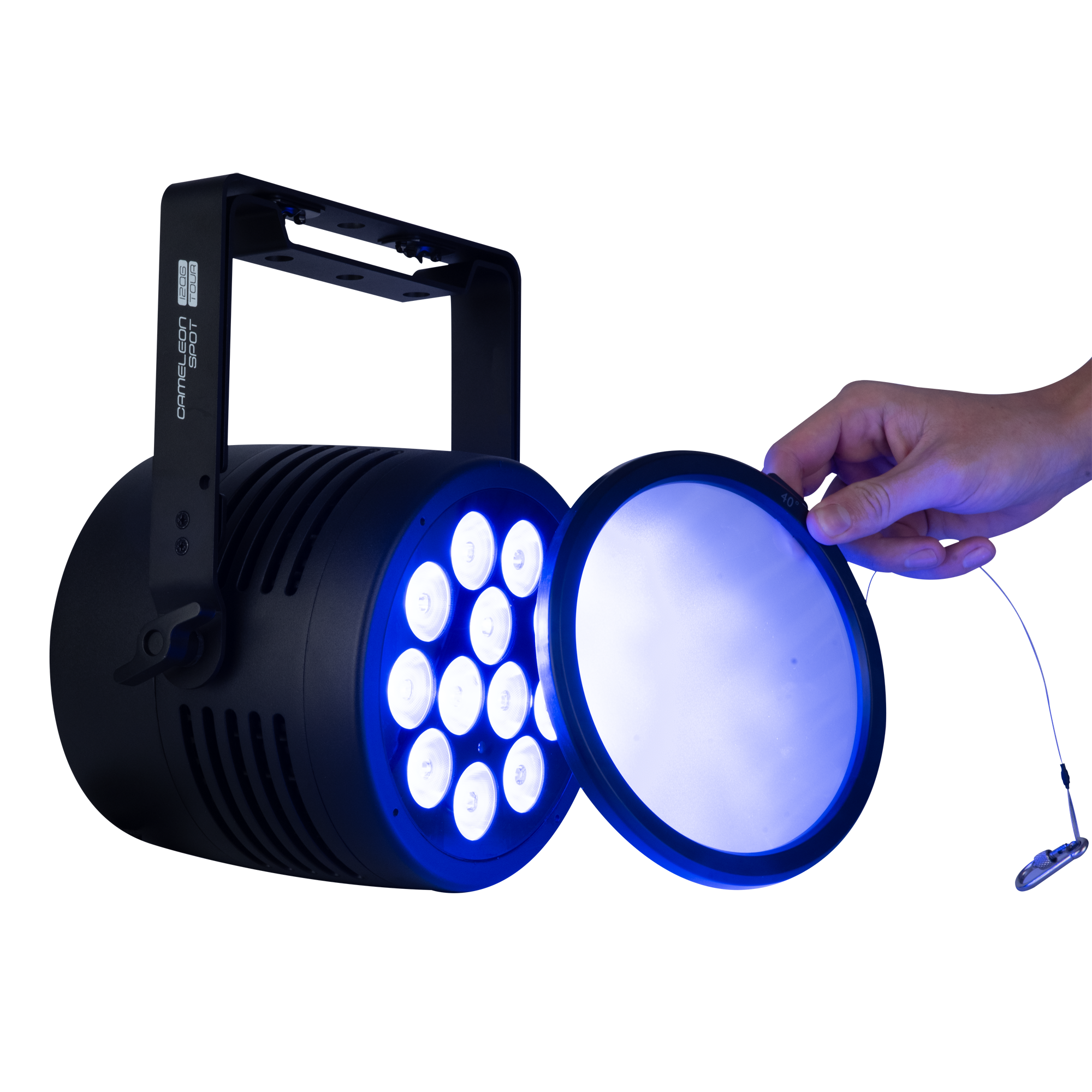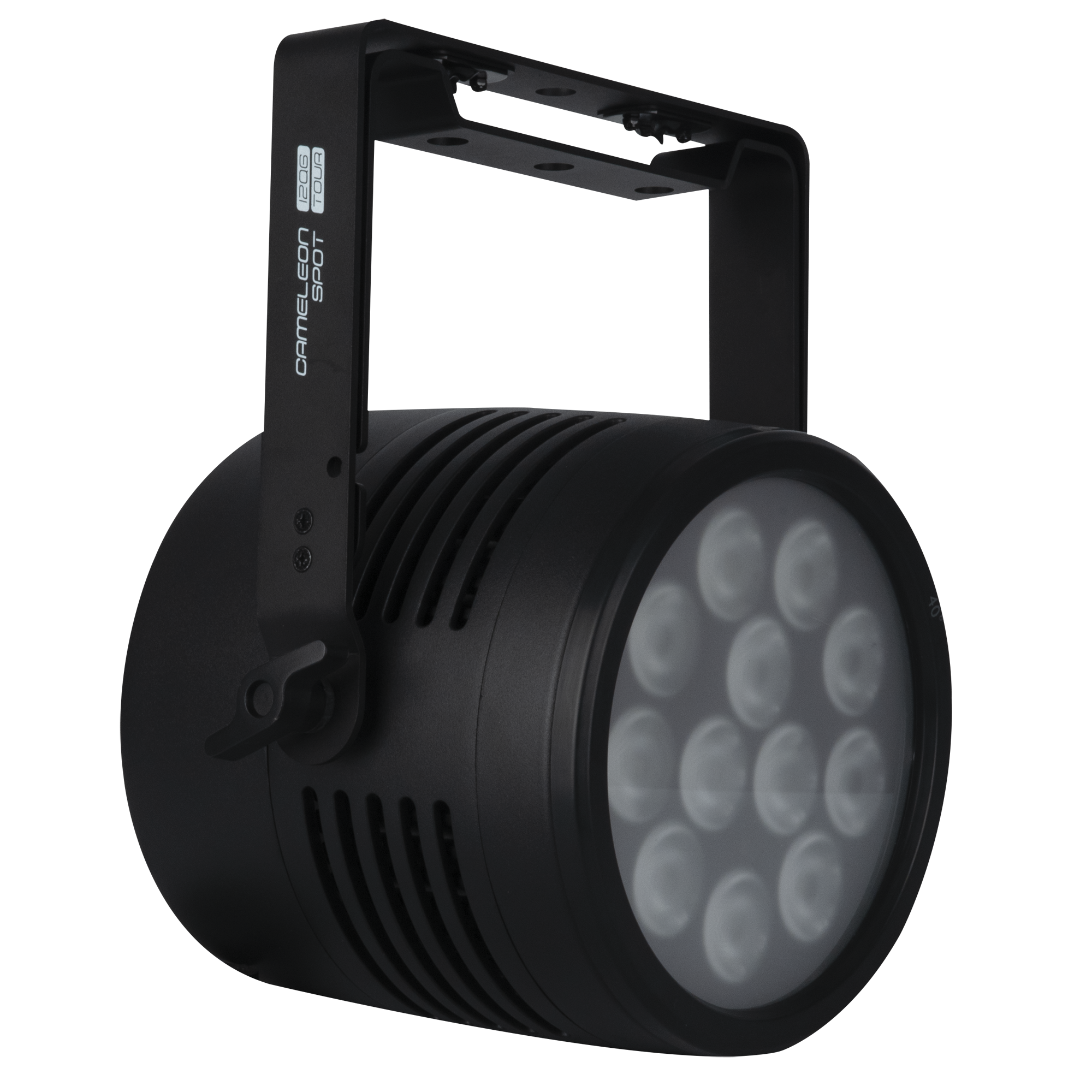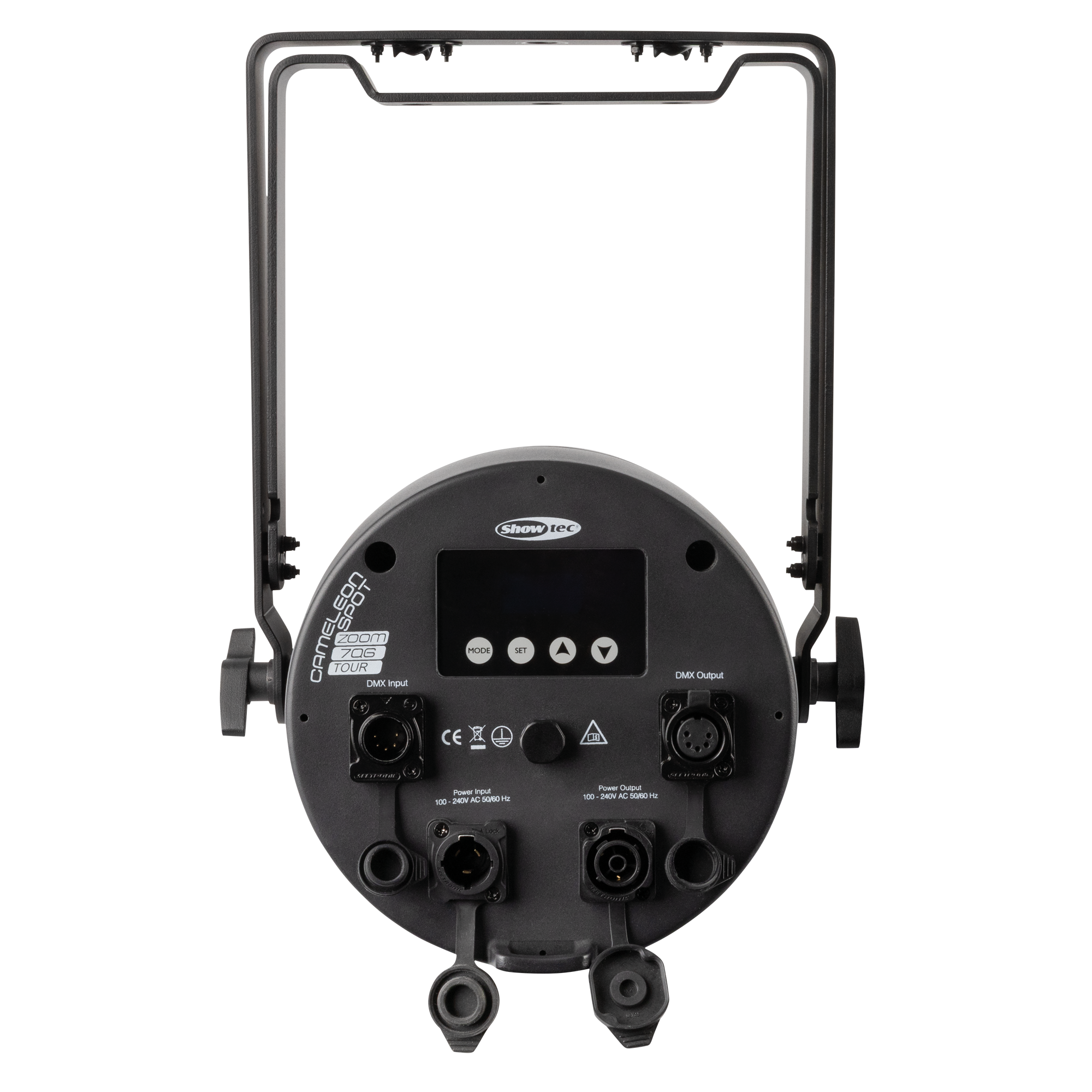 De Cameleon Zoom Spot 7Q6 Tour is een LED-spot met zeven 50 watt RGBWA-UV LED’s. Hij heeft een gemotoriseerd zoombereik van 6° tot 45° en beschikt over een dimmerregeling van 0-100% en stroboscoopeffecten van 0-20 Hz. Met kleuren-presets, ingebouwde kleurenmacro’s en 4 selecteerbare dimcurves is hij gemakkelijk te gebruiken. Dankzij instelbare PWM-frequenties is ook flikkervrij filmen mogelijk. Hij kan worden aangestuurd via DMX (incl. RDM) of worden bediend in Auto- of Master/Slave-modus. Handmatige bediening is ook mogelijk via het OLED-display en de touch-knoppen. De behuizing, de 3-pins XLR-connector en de Seetronic Power Pro True-connectoren hebben allemaal IP65-classificatie, waardoor de Cameleon Zoom Spot 7Q6 Tour ook geschikt is voor gebruik buitenshuis.